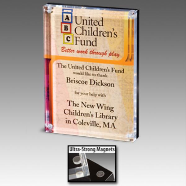 Our Unique Stand Out Digital Color Entrapments consist of two acrylic pieces held together by very strong magnets. You can mount any photo or printout of your choice between the layers, and our laser engraving option provides a frosted finish for excellent contrast. Additionally, our full-color printing option adds a vibrant touch to your artwork. Whether you want to recognize an outstanding employee, a top-performing student, or an exceptional team, our acrylic award is the perfect way to show your appreciation.