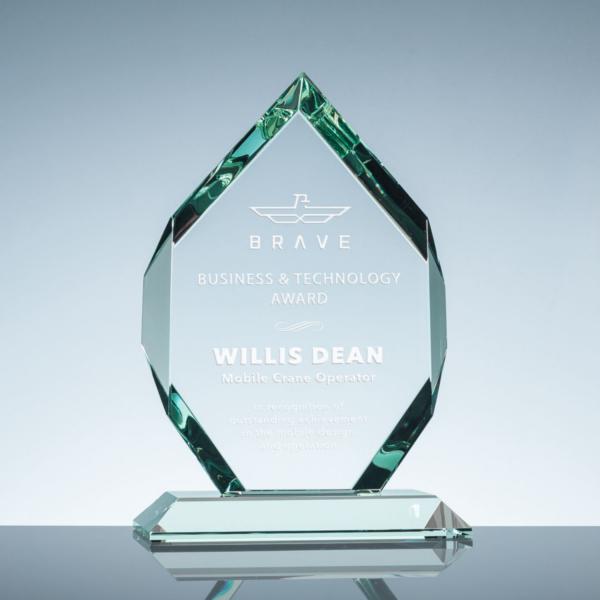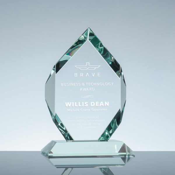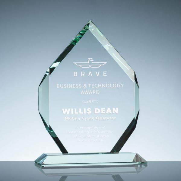 3/4" thick starfire clear glass. Are you searching for a distinctive and visually striking way to recognize your exceptional employees, outstanding students, or an entire team? Our Clear Glass Royal Diamond award is a perfect choice for you. This elegant 3/4" thick Starfire clear glass features large beveled edges. The deep sand-etching allows you to create a breathtaking work of art that is guaranteed to impress. It is an excellent way to acknowledge and honor the hard work and dedication of those who deserve it. So, do not wait and order now to recognize your top performers!