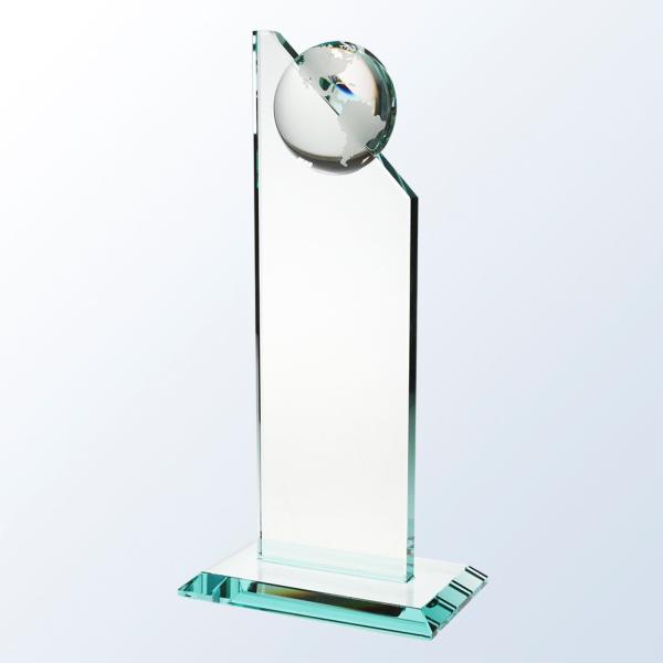Introducing our stunning Jade Glass World Globe Pinnacle! This gorgeous award features an intricately etched map of the continents on a half sphere, which is securely glued at the top of the Pinnacle-shaped award. It is the perfect choice to recognize a global partner or to show appreciation for someone's worldly achievements. Our deep sand-etching technique ensures exquisite results that are sure to leave a lasting impression.