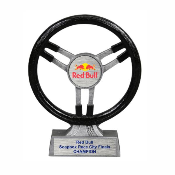 This Steering Wheel Trophy features a silver and black design with a 2" custom printed logo disc in the center of the wheel as well as an engraved plate at the base of the award. Great for NASCAR, Pinewood Derby and other racing competitions.