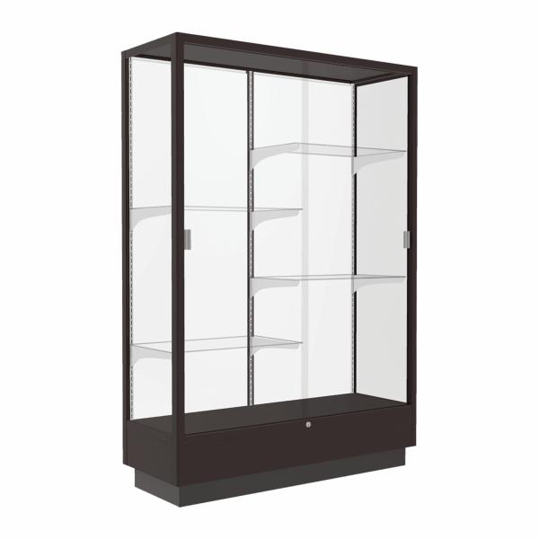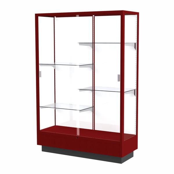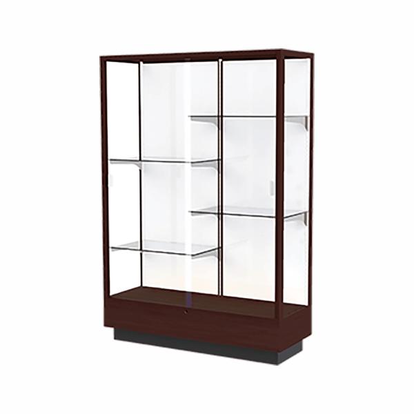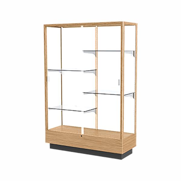 CALL TO PLACE ORDER The Heritage series contains solid oak and wood-look laminates chosen for their durability. These fully assembled display cases are built on a 10" high base and offer standard features such as sliding tempered glass doors, built-in locks, steel shelving hardware, and floor levelers. A clear top allows overhead lighting to accentuate all achievements and tempered glass doors lock to secure the display case contents. Each 4 ft wide case includes 4 half-length adjustable shelves.